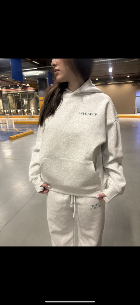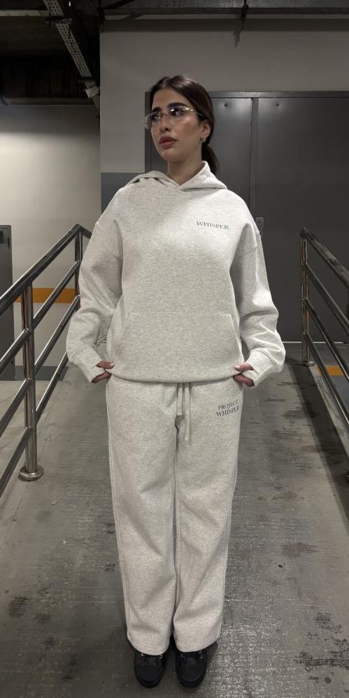 طقم كامل أوفر سايز مكوّن من هودي وبنطلون بلون رمادي فاتح أنيق.